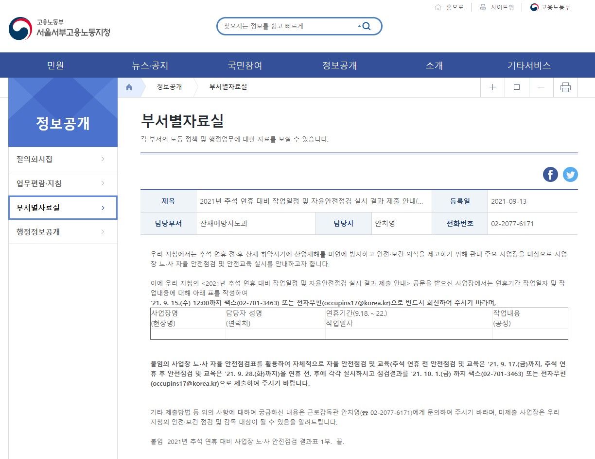 2021년 추석 연휴 대비 작업일정 및 자율안전검검 실시 결과 제출안내
