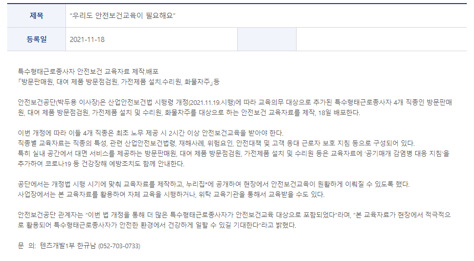 뉴스·소식 > 보도자료 “우리도 안전보건교육이 필요해요” (moel.go.kr)